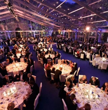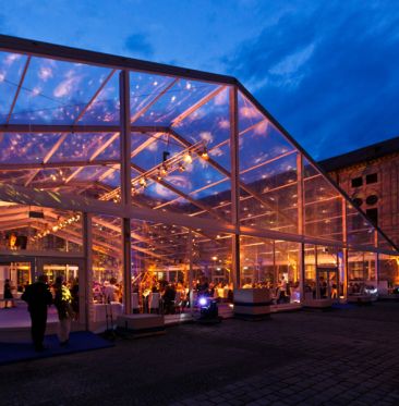 Gestaltung des Dinners in einem Glaspavillon im historischen Kaiserhof mit Raum- und Tischdekoration