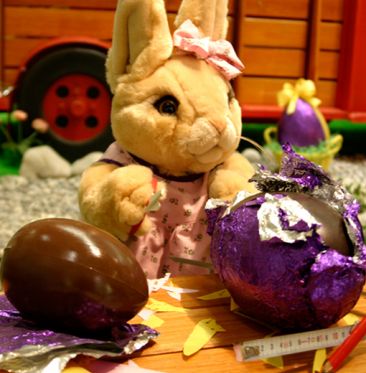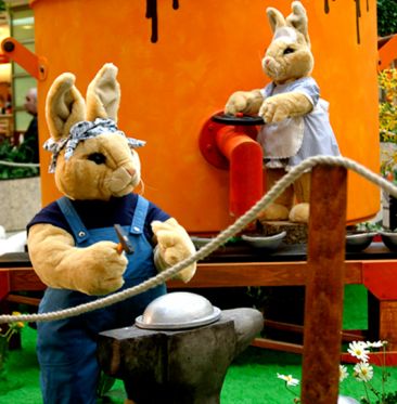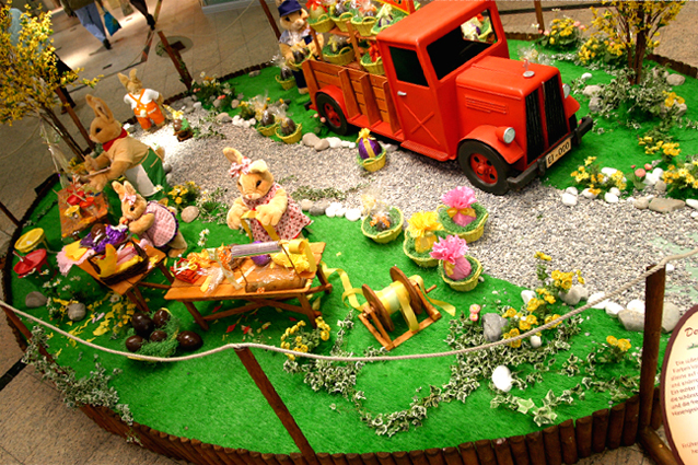 Um die Geschichte des Kakaos und der Schokoladenherstellung kindgerecht zu vermitteln, inszenierte COREOGRAFIA PRODUCTION eine Osterlandschaft mit passender Hasenfabrik und stellte auf spielerische Art und Weise die Produktion von Schokoladeneiern dar.